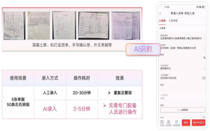 在工地,比扛鋼筋更累的是錄單據——合同、結算單、出入庫單,年輕技術員每天花幾小時對著紙質單據敲鍵盤,枯燥易錯,毫無成就感。紅圈AI深刻理解這些場景:成本專員需手動處理合同文本,逐頁閱讀并提取關鍵信息;施工班組每月提交的紙質結算單需逐條輸入系統;單項目材料種類可達數千種,材料員需每天及時逐條輸入出入庫信息。